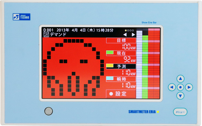 使用電力量やデマンドなどをリアルタイムに表示できるSMARTMETER ERIA。これまではデマンドピークに近づくと、パトランプが回転し、注意喚起していたが、お客さまからは普段から使用量の増減が把握できるメーターがあるとよいという意見があった。そこで、パトランプに代わってニコちゃんの表情や色、さらに警報音などで電気の使用状況を知らせる本品が誕生した。当社独自のわかりやすい電気の「見える化」ツールとして、現在に至っている(登録商標:第5276969号)。