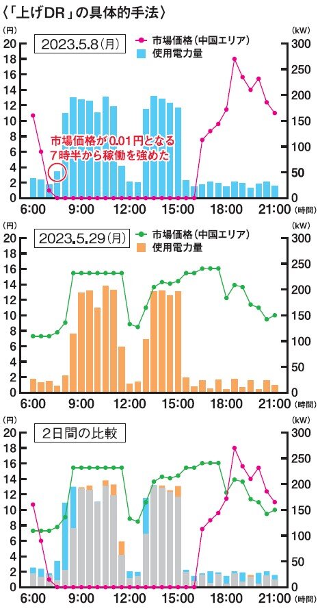 同社では毎日正午ごろにミーティングを行い、翌日の砕石の発注量などのすりあわせと同時に日本テクノの卸電力市場価格を表示するサイト「環境市場」を確認する。その際、翌日の市場価格動向をもとに機械の稼働時間を調整する。5 月29 日はごく一般的な日の稼働状況。これに対し、5月8日は市場価格が7時30分から0.01 円となったため、通常は8 時からの業務開始時間を前倒し。早めに砕石を開始する「上げDR」を行った。ちなみに市場価格が上がった場合は設備メンテナンスや資材リサイクルなど、プラントを稼働しない業務を行う考えだ。